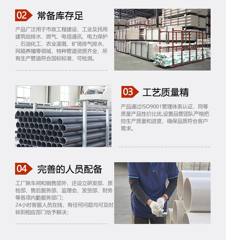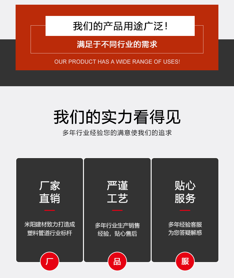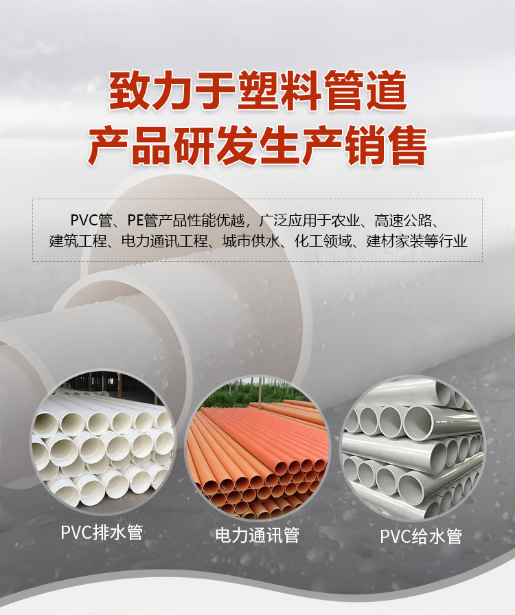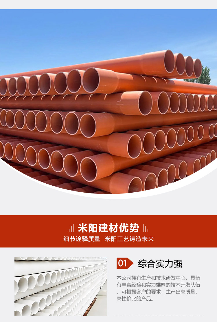 米陽建材是一家集研發、生產、銷售于一體的企業。主要從事PVC塑料管道、PVC給排水工程管、電力通訊管、橋梁排污管、電工套管、農業農田灌溉管等生產與銷售。產品銷往全國各地,廣泛應用于農業、高速公路、建筑工程、電力通訊工程、建材家裝等行業。